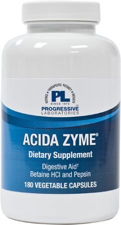 Acida-Zyme is a dietary supplement designed to support digestive health with a blend of enzymes and natural ingredients. Each bottle contains 180 vegetable capsules, packaged to be compatible with a plant-based lifestyle.