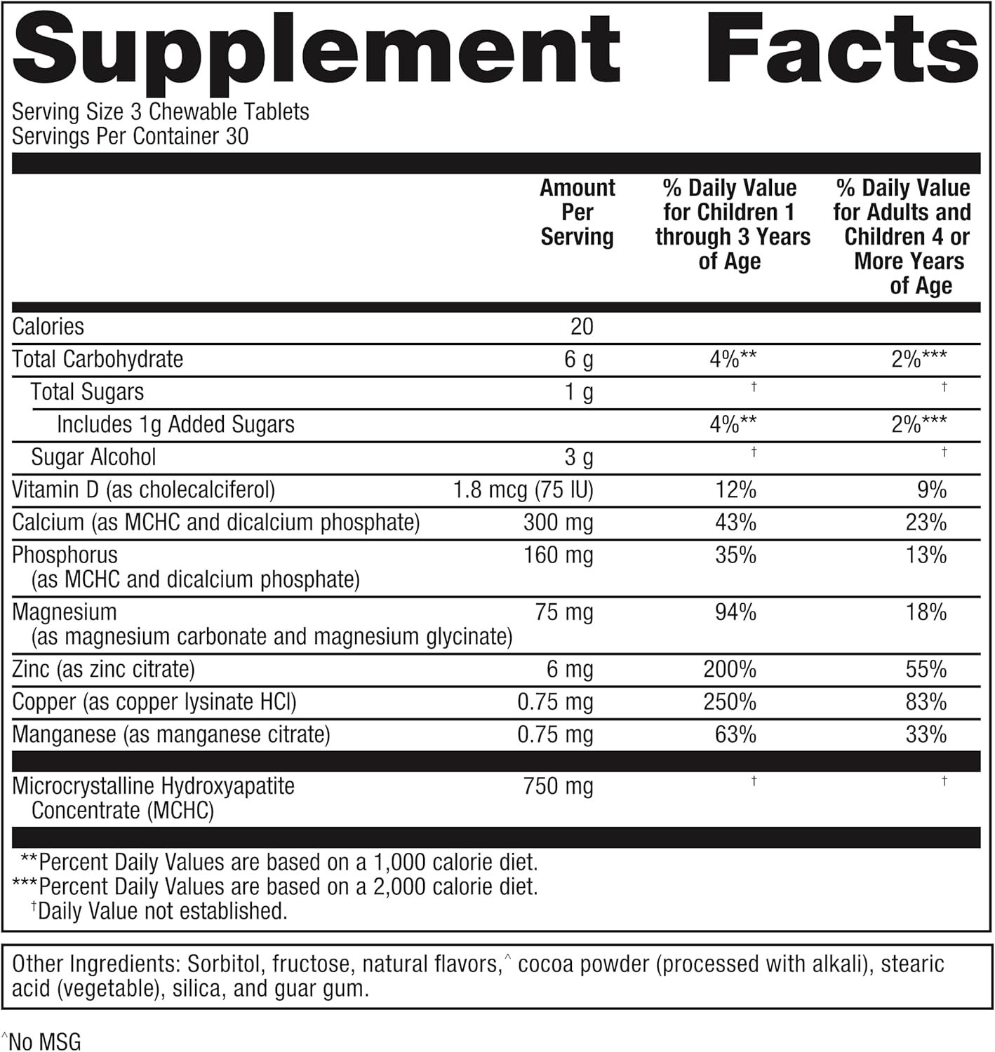 Cal Apatite Bone Builder Chewable provides excellent bone health support with microcrystalline hydroxyapatite concentrate (MCHC), a highly absorbable crystalline compound that provides everything found in healthy bones and is backed by more than 30 years of research. MCHC contains naturally occurring calcium, phosphorus, and trace amounts of other minerals, bone growth factors, collagen and other vital bone proteins. This well-rounded formula is designed to support bone mineral density and also features vitamin D and additional magnesium for enhanced bone health support. Ideal for those who prefer chewable tablets.