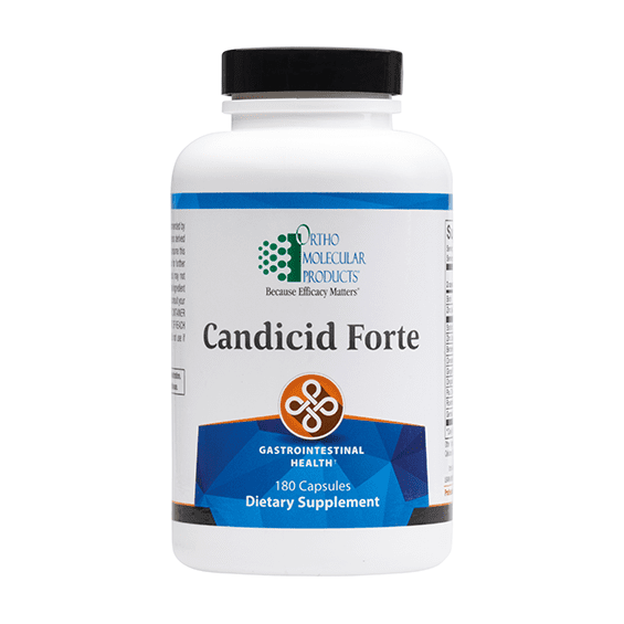 Formulated with the goal of building a healthy gastrointestinal (GI) flora, Candicid Forte includes biotin, a nutrient that inhibits yeast from converting into the more aggressive fungal form. In addition, sodium caprylate is included to disrupt the metabolism of Candida and create a hostile environment for colonization. It also includes potent botanicals, such as berberine HCl, Pau d’Arco, oregano, rosemary, cinnamon and ginger, to soothe the GI tract, provide potent antioxidant support, and ensure microbial balance.