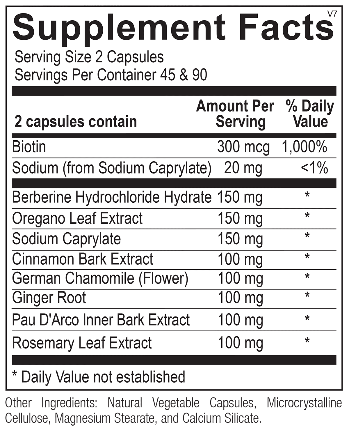 Formulated with the goal of building a healthy gastrointestinal (GI) flora, Candicid Forte includes biotin, a nutrient that inhibits yeast from converting into the more aggressive fungal form. In addition, sodium caprylate is included to disrupt the metabolism of Candida and create a hostile environment for colonization. It also includes potent botanicals, such as berberine HCl, Pau d’Arco, oregano, rosemary, cinnamon and ginger, to soothe the GI tract, provide potent antioxidant support, and ensure microbial balance.