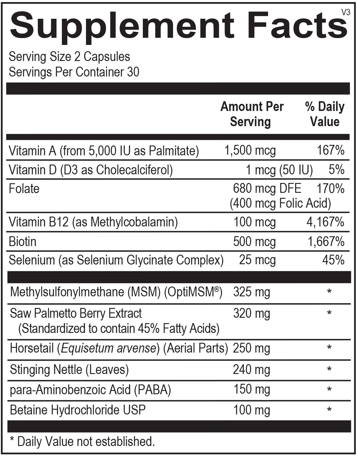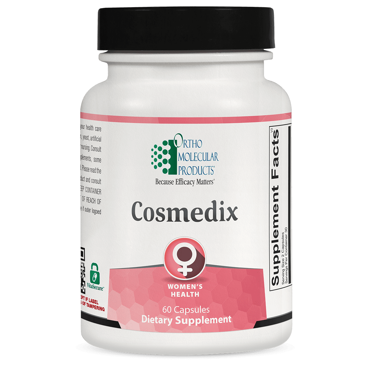 Cosmedix provides several essential vitamins, minerals and phytonutrients needed to support healthy skin, hair and nails. Cosmedix provides betaine HCl, which helps to promote efficient digestion and assimilation of proteins and minerals necessary for hair and nail health. It includes MSM, which provides a bioavailable source of sulfur, for connective tissue integrity. Saw palmetto is added to support normal levels of DHT, known to play a role in the thickness and health of hair. In addition, silica (from horsetail grass extract) is included for its collagen-enhancing properties. Each serving of Cosmedix contains 100 mg betaine HCl, 320 mg of saw palmetto and 325 mg MSM. Added support from vitamin A, vitamin D3, folic acid, vitamin B12, biotin and selenium provide a full spectrum of skin, hair and nail support.