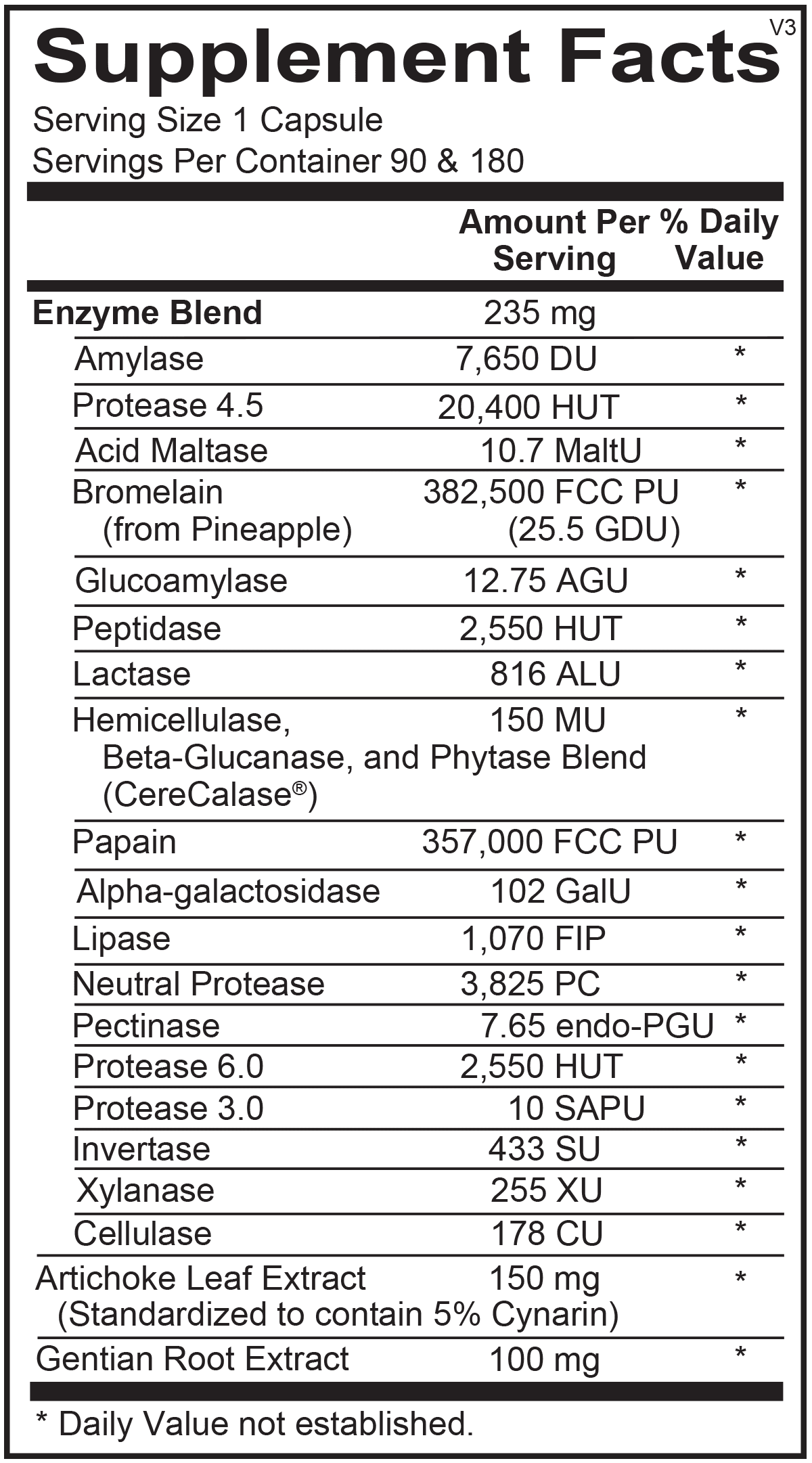 • Digestzyme-V is a comprehensive blend of acid-resistant, plant-based enzymes designed to help maximize the digestion and absorption of nutrients from food. Each capsule includes lipase, amylase, lactase, CereCalase and protease to aid in the digestion of protein, fat, starches, fiber and other difficult to digest foods known to cause food sensitivities. CereCalase, a special blend of hemicellulase, beta-glucanase and phytase, is specially formulated to digest the cell walls of plants, providing better nutrition from a plant-based diet. Digestzyme-V also contains Gentian root, a traditional bitter herb as well as artichoke, a natural choleretic, added to stimulate the body’s natural production of enzymes and bile.