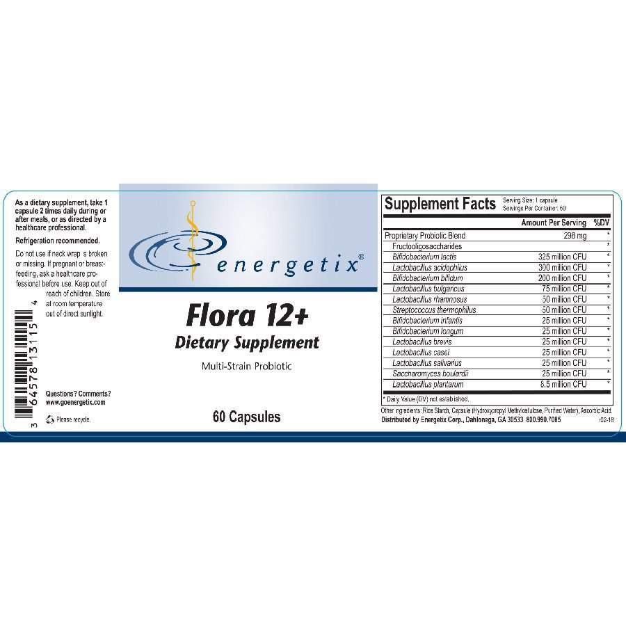 Flora 12+, a multi-strain probiotic, is a combination of twelve beneficial bacteria plus saccharomyces boulardii and the prebiotic fructooligosaccharides (FOS). This synergistic probiotic blend helps support normal digestion, a healthy intestinal barrier, and normal immune response through the repopulation of the GI tract with helpful bacterial strains.