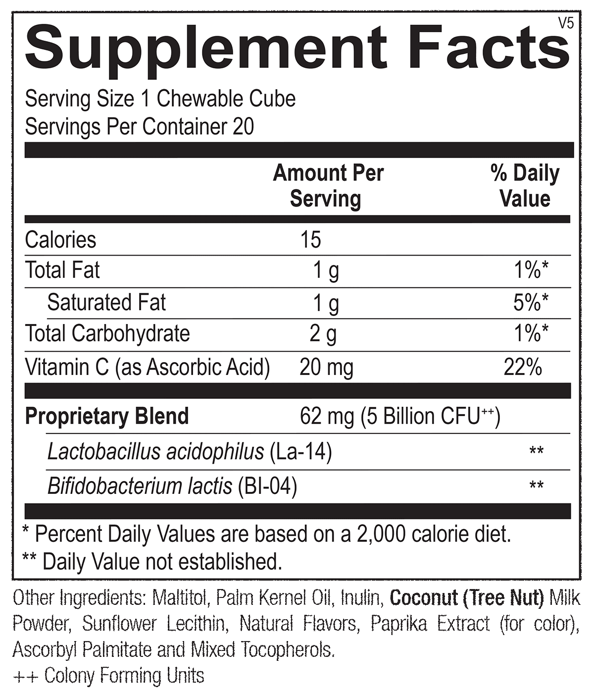 Flora Bites is a tasty, chewable probiotic for children that supports healthy gut microflora, immune function, and digestive health, featuring a blend of 5 billion CFU of beneficial bacteria and vitamin C in a fun, natural orange-flavored cube.